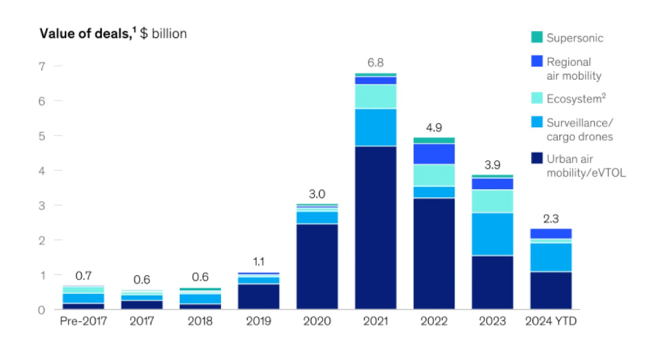 The advanced air mobility industry is facing an increasingly challenging funding environment amid an ongoing decline in venture capital for novel aircraft and propulsion technologies—particularly in the eVTOL sector, according to a report from global management consulting firm McKinsey & Company. In a recent blog post, McKinsey consultants spell out the implications of the current funding environment and offer strategic advice for companies looking to “close the funding gap” as they near commercialization. |