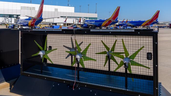 JetWind Power is urging airports to harness energy generated by engine thrust as airplanes start taxiing to the runway. According to the Texas-based start-up, a three-year trial operation at Dallas Love Field Airport (KDAL) established that each of its Energy Capturing Pods, which consist of five small airfoil wind turbines enclosed by a protective mesh, can generate between 50 and 80 kilowatts of electricity each day. |