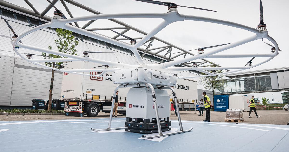 During a proof-of-concept trial at Germany's Stuttgart Messe convention center, Volocopter and logistics group DB Schenker evaluated multiple aspects of ground operations with the VoloDrone eVTOL vehicle.